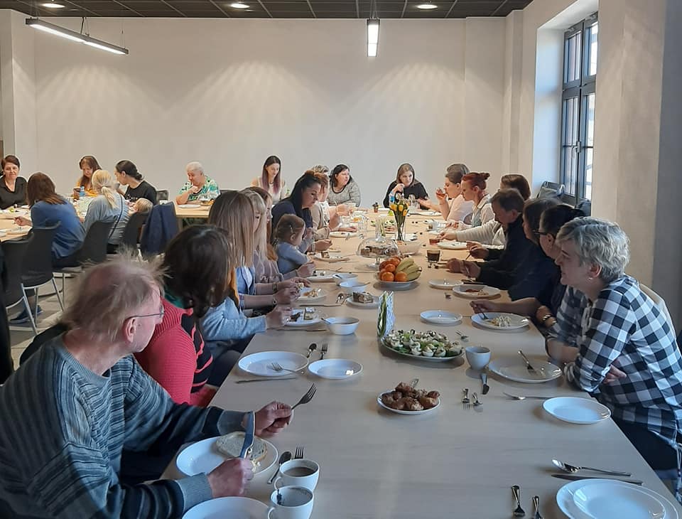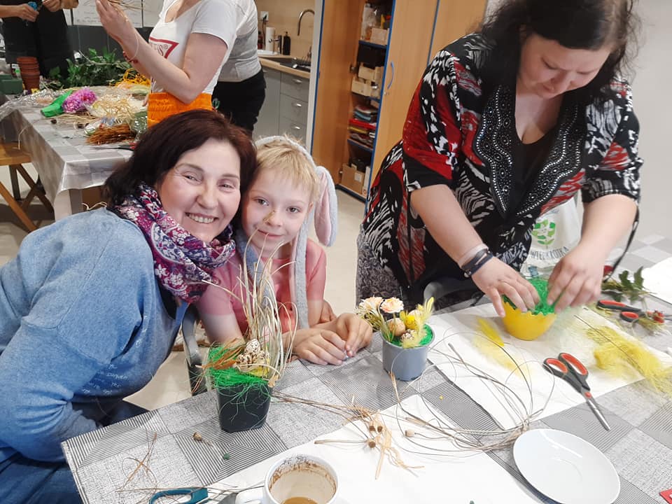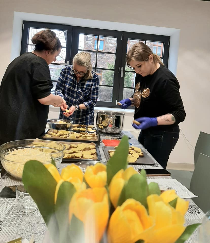 Jak już wspominaliśmy kwiecień to okres Świąt Wielkanocnych, dlatego też zajęcia kulinarne nawiązywały do tego wydarzenia. Na zajęciach wspólnie z uczestniczkami projektu przygotowałyśmy potrawy na wielkanocny stół, zaś przygotowane dania zjedliśmy na spotkaniu świątecznym. Cały czas doskonalimy nasze umiejętności szycia na maszynie oraz szycia ręcznego. Tym razem tworzyliśmy poduszki dla dzieci z Ukrainy. W tym trudnym dla nich czasie, chcemy dać im trochę poczucia bezpieczeństwa i odrobinę radości. W ramach spotkań z instytucjami, w kwietniu zaprosiliśmy pracowników i wolontariuszy zabrzańskiego Oddziału PCK. Spotkanie stało się okazją do przedstawienia palety naszych działań i zastanowienia nad dalszymi formami współpracy. Na to spotkanie zaprosiliśmy również uchodźców wojennych z Ukrainy wraz dziećmi. Maluchom przekazaliśmy uszyte wcześniej poduszki.
